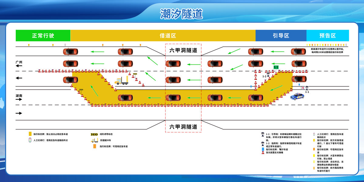 节后返程高峰,六甲洞隧道1.9公里路段启动“潮汐隧道”――南行小车借道北行隧道通行,每分钟通行量从40辆次提升至60辆次,通行能力提升50%;