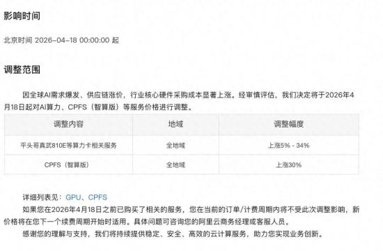 阿里云官网发布公告称,平头哥真武810E等算力卡产品上涨5%―34%,文件存储CPFS(智算版)上涨30%。随后,百度智能云也发布调价公告,宣布AI算力相关产品上调约5%―30%,并行文件存储上调约30%。