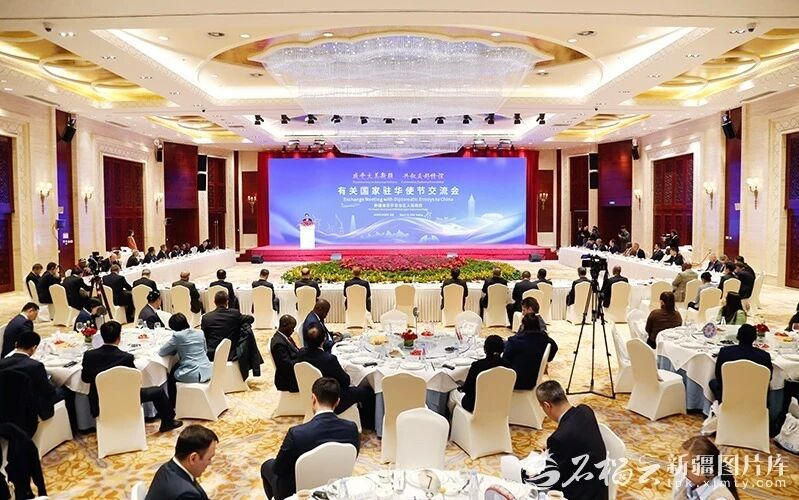 北京新疆大厦木卡姆厅洋溢着热烈友好的氛围。来自40个国家的驻华大使、外交官和有关国际组织代表出席交流会。